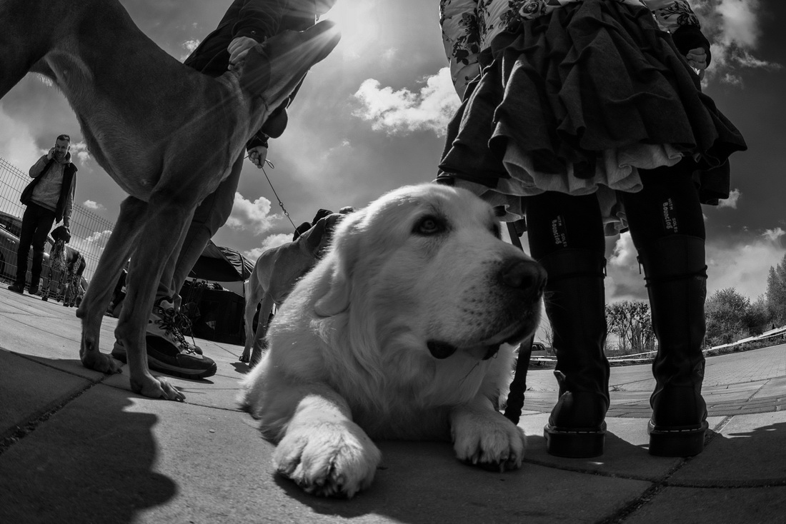 Pies ze swej perspektywy zagląda pod spódniczkę jak gdyby nigdy nic.